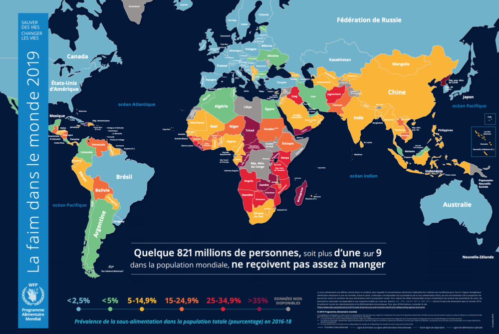 Voici la carte de la sous-alimentation sur la planète, la sous-alimentation étant définie comme la condition dans laquelle la consommation alimentaire habituelle d’un individu est insuffisante pour fournir l’apport énergétique alimentaire nécessaire à une vie normale, active et saine.